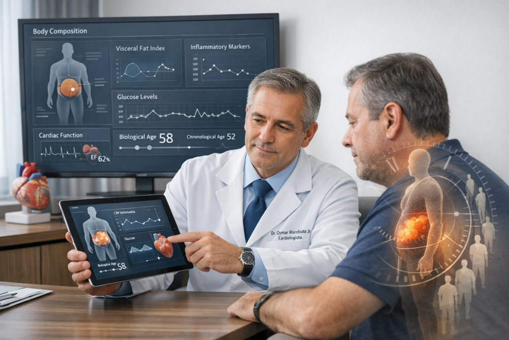 Há outro fenômeno importante: a redistribuição da gordura no corpo com o tempo. Muita gente diz: “Doutor, estou com o mesmo peso, mas a barriga aumentou”. Isso não é imaginação. Com o passar dos anos, tende a haver mais gordura visceral (aquela que fica “por dentro”, envolvendo órgãos) e mais infiltração de gordura em locais onde ela não deveria estar, como fígado e músculo. Esse tipo de gordura é metabolicamente mais perigoso e conversa com o organismo de um jeito mais inflamatório.